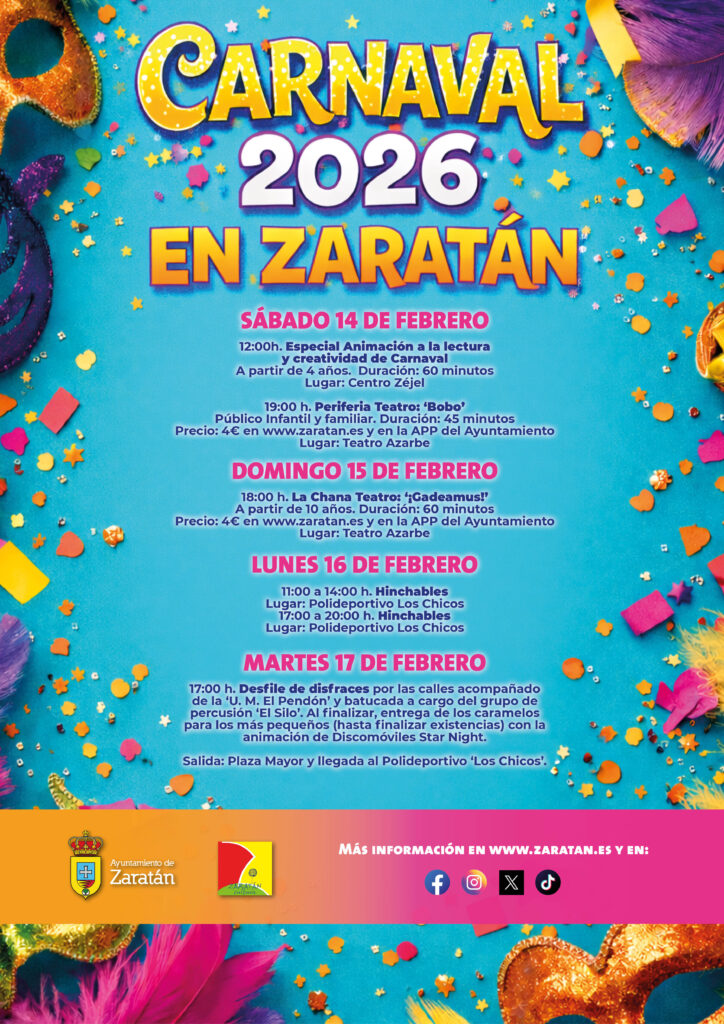 Las actividades arrancarán el sábado 14 a las 12:00 horas con un taller de animación a la lectura y creatividad de carnaval para niños y niñas a partir de 4 años en el Centro Zéjel, mientras que por la tarde el Azarbe copará las miradas con la llegada a escena de Periferia teatro y su obra ‘Bobo’.